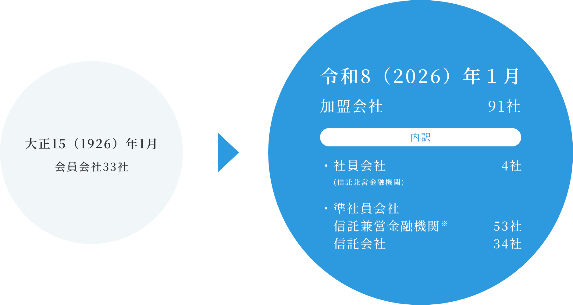 更に、平成16(2004)年の信託業法の改正に基づく信託会社の参入、また、協同組織金融機関や都市銀行等の断続的な参入により、加盟会社は増加を続け、創立100周年を迎える令和8(2026)年1月時点では、91社となりました。