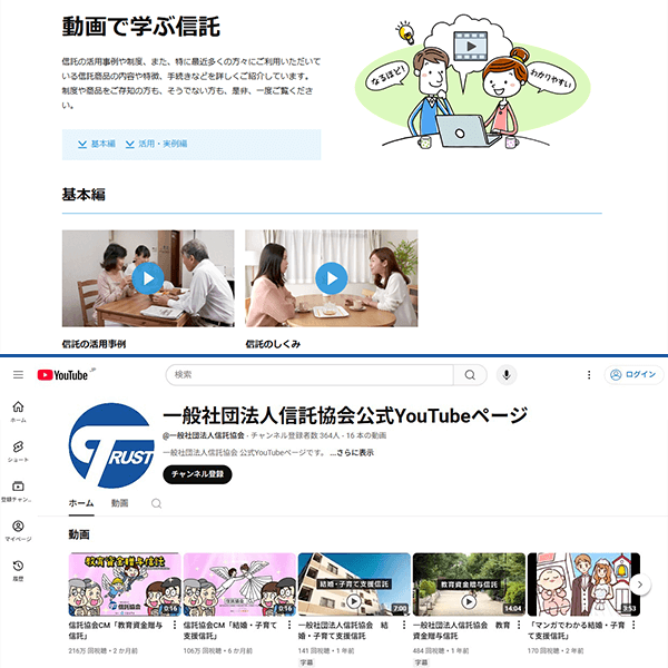 基本編「信託の活用例」等、活用・実例編「教育資金贈与信託」等計8つの動画を作成し、信託協会ホームページおよびYoutubeページで公開