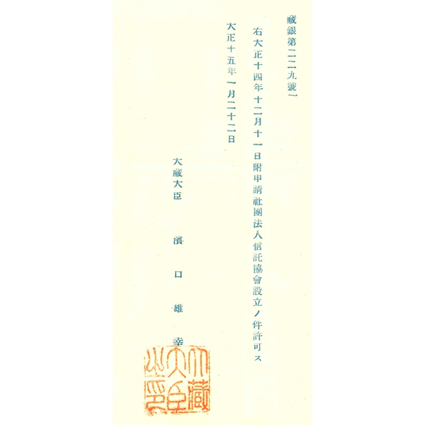社団法人信託協会設立認可証(抜粋合成)